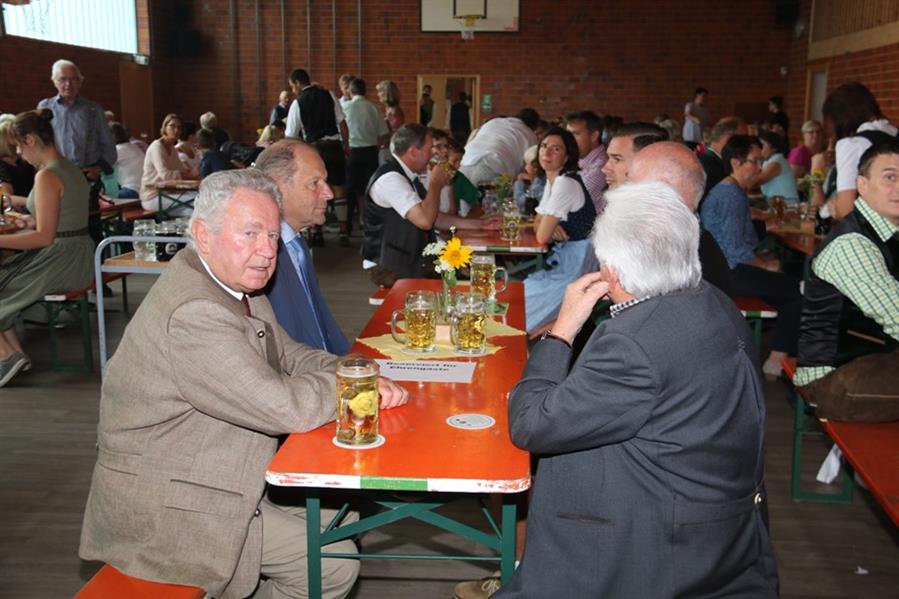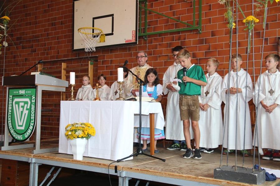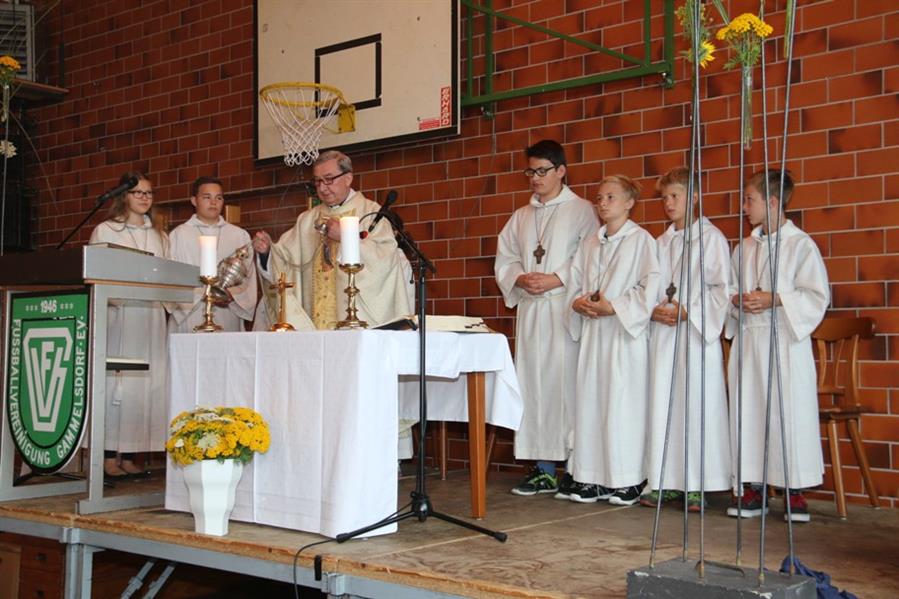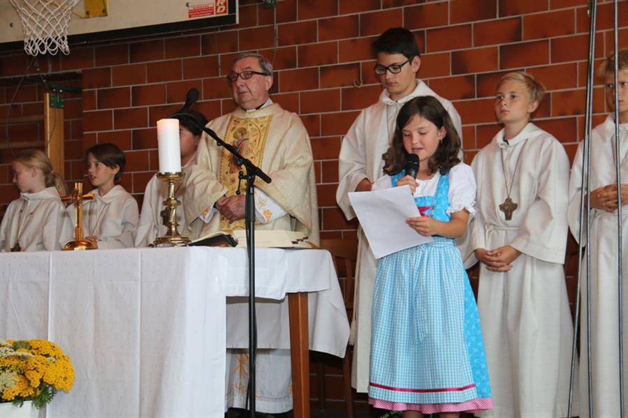 Die Wetterprognosen waren alles andere als aufheiternd und so musste um 8 Uhr morgens der Beschluss gefasst werden, sowohl den Festgottesdienst als auch den im Freien stattfindenden Mittagstisch in die Turnhalle zu verlegen. Eine kluge Entscheidung wie sich herausstellte, denn immer wieder besuchte Petrus mit einigen Regenschauern das Fest.