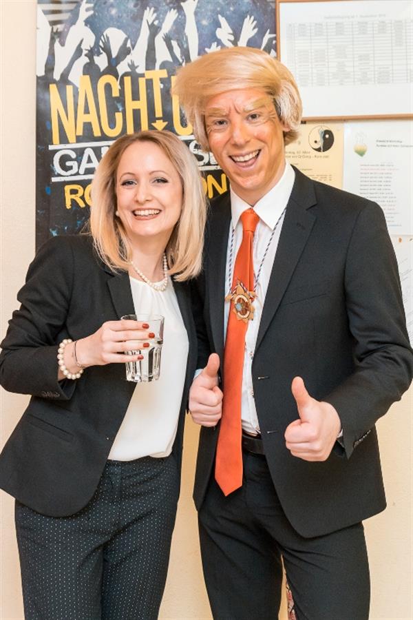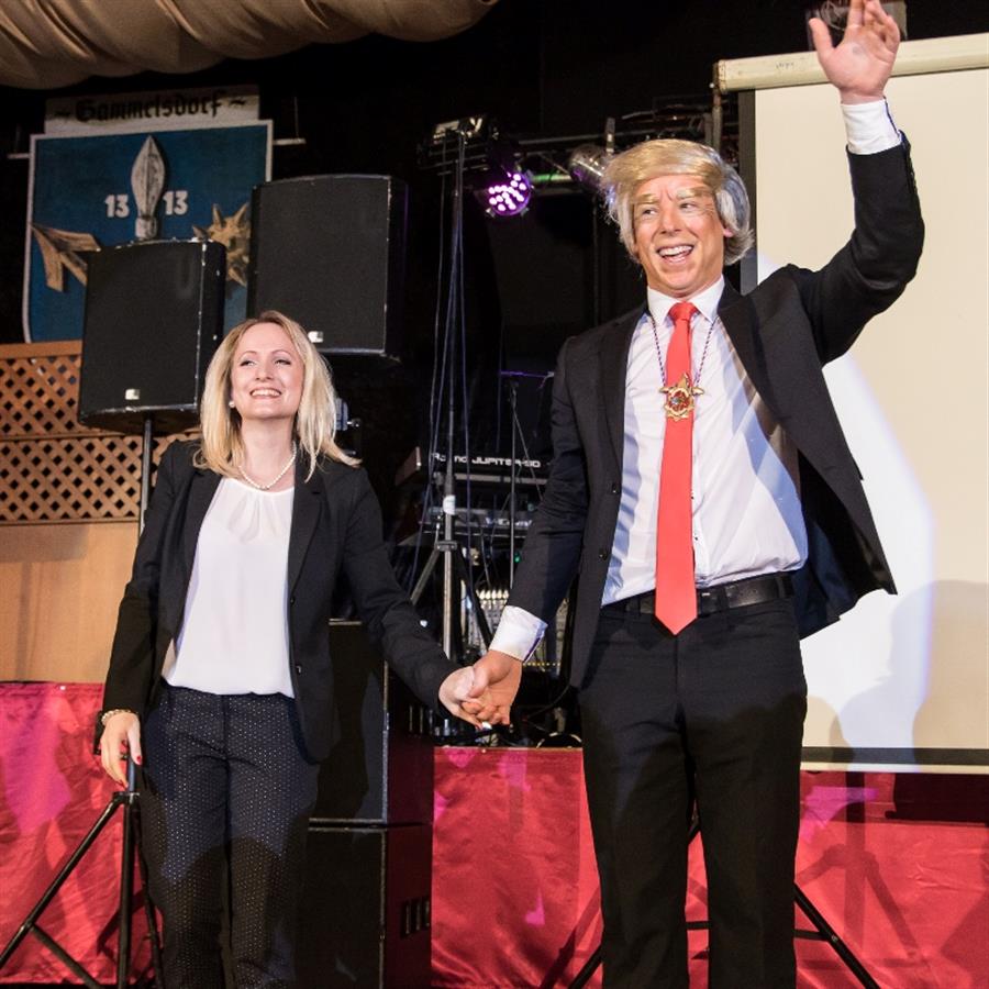 Eine zusätzliche maskierte Einlage prägt den Narrhallaball und die Wiederholung gibt es dann beim Sportlerball. Der amerikanische Wahlkampf prägte in diesem Jahr die Einlage. Konrad Glück als Donald Trump und Monika Pichlmaier als Hillary Clinton überzeugten in ihren Rollen absolut und sowohl die Exprinzen als auch die Exprinzessinen sowie ehemalige Narrhallesen begeisterten mit ihren Einlagen. Lang anhaltender Applaus war der Lohn für die Mühe und tolle Idee und vor allem der gesamten Darbietung.